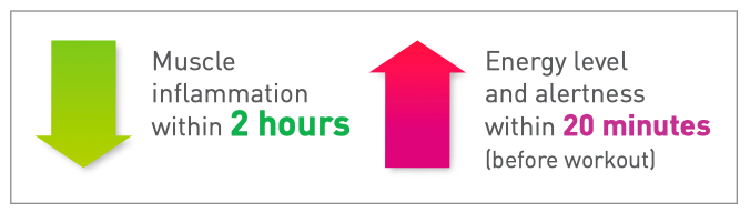 Cuts post-exercise inflammation and boosts energy within 20 minutes and recovery within 2 hours.